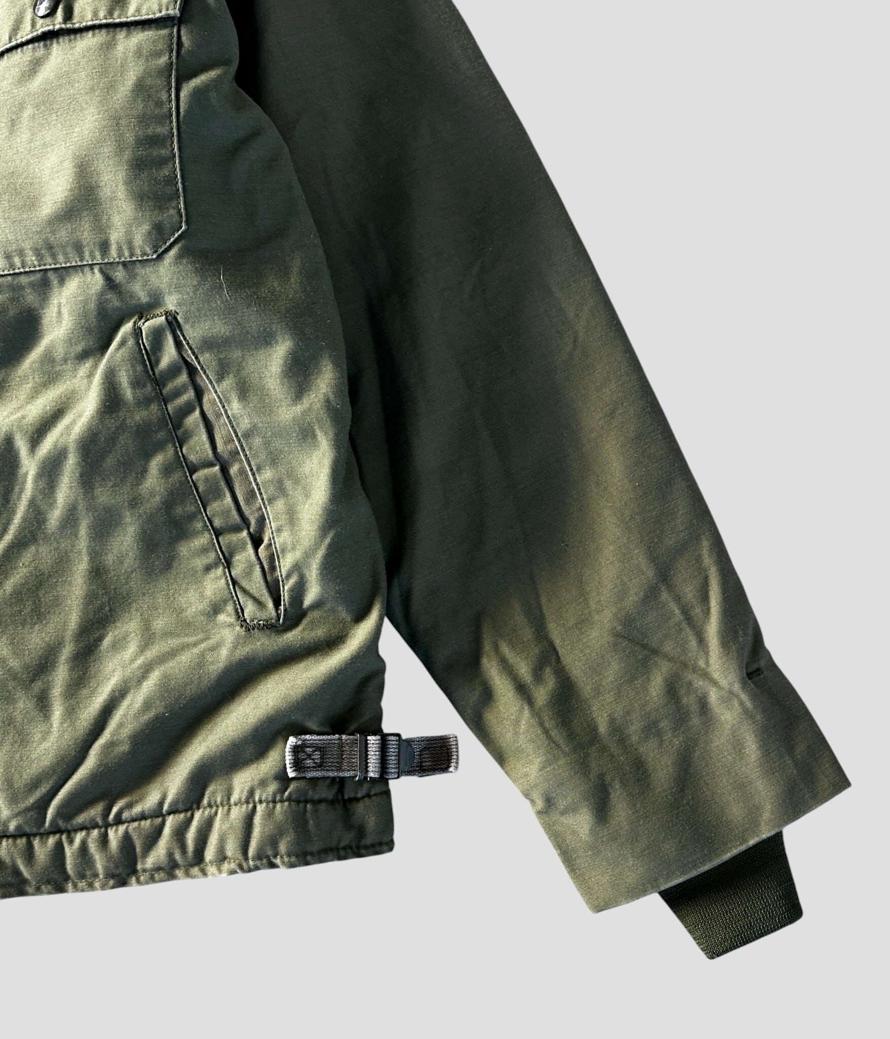 N-1の後継として登場したA-2デッキジャケットは、襟ボアなし、アクリルボアの裏地、コットンとナイロンの防風シェル、比翼仕立てのフロント、裾のサイドアジャスターが特徴。