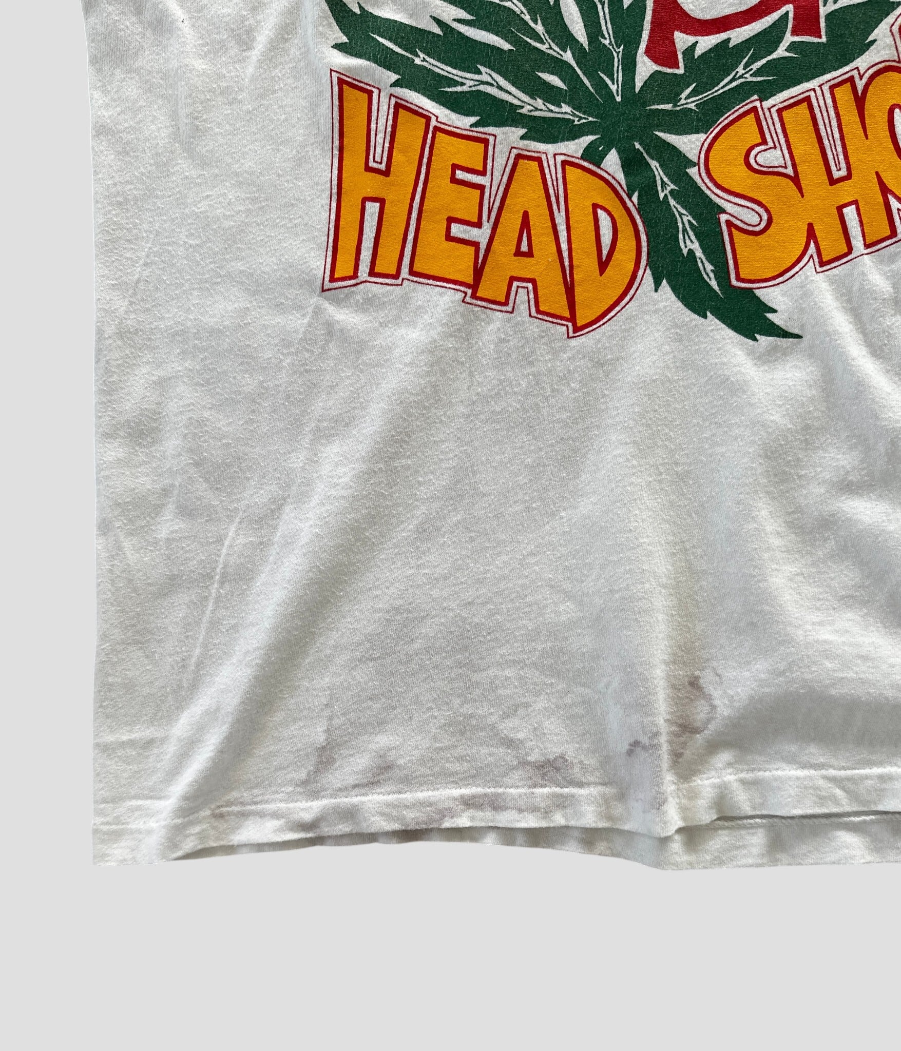 ヘッドショップの宣伝Tシャツ、またはレゲエやヒップホップなどの音楽カルチャーに関連する1着。