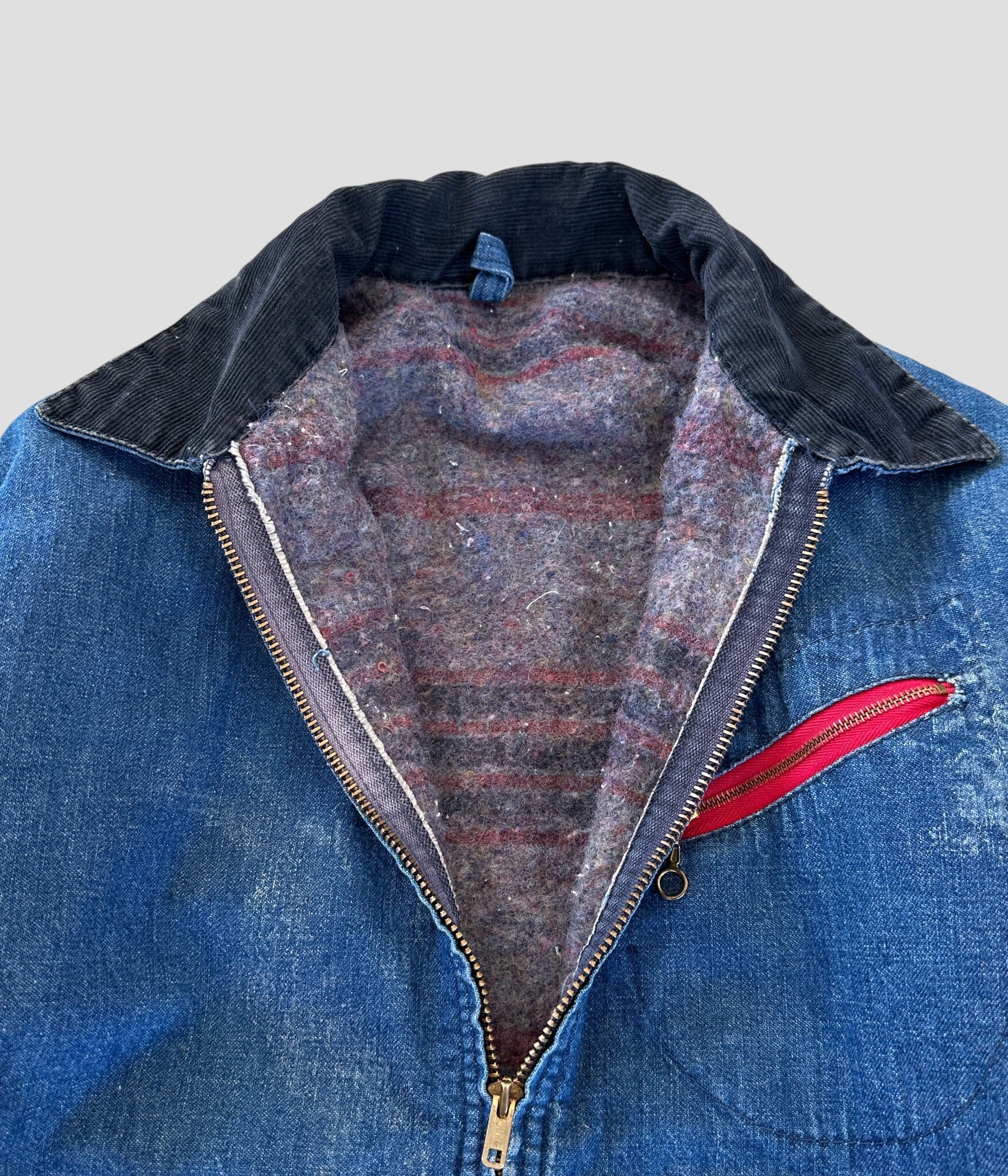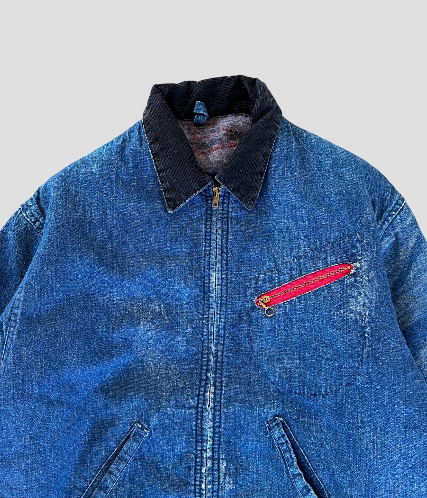 襟元のコーデュロイ、ブランケット裏地など防寒性の高いデニムワークジャケット。