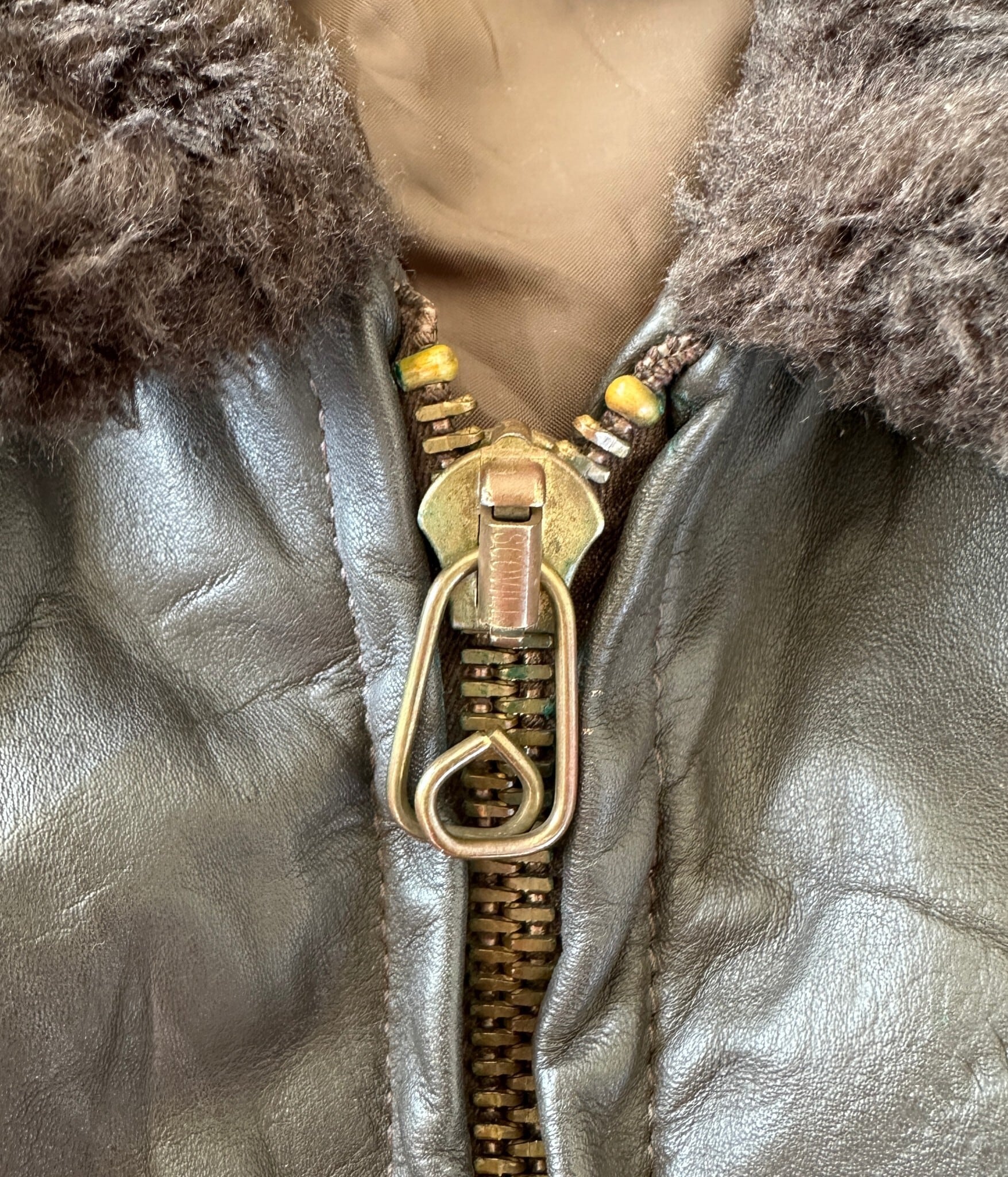 70年代特有の重厚なレザーと首元のボリュームあるムートンボアが特徴。