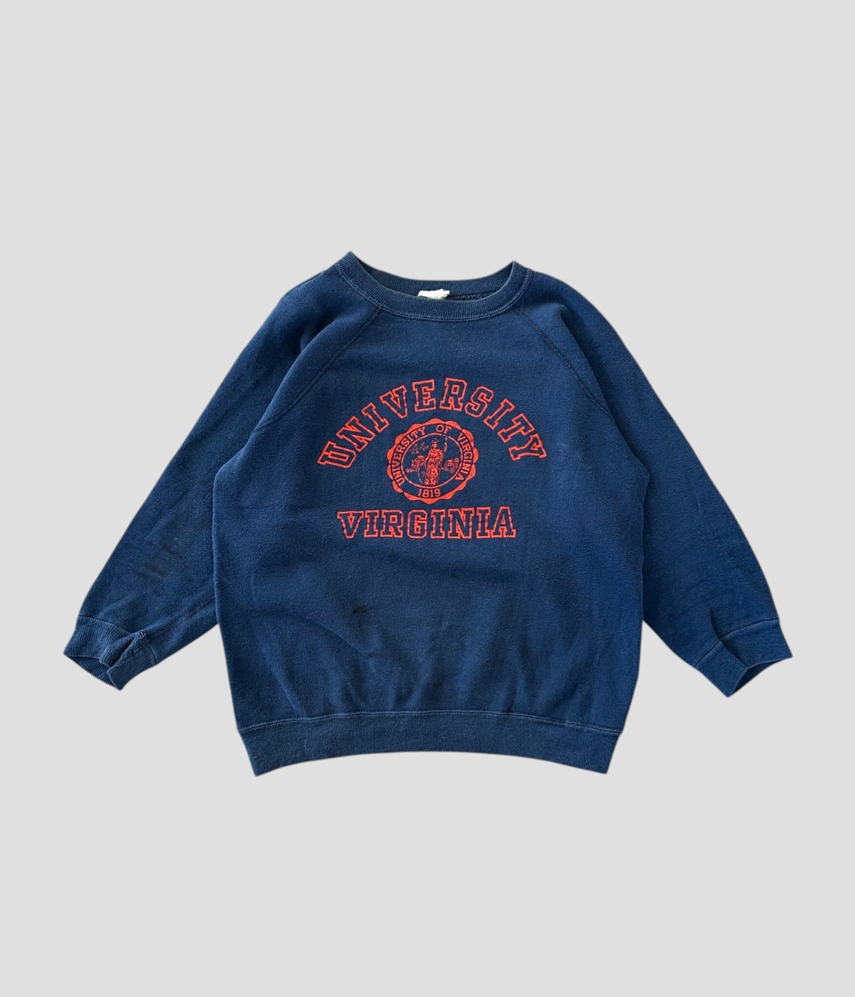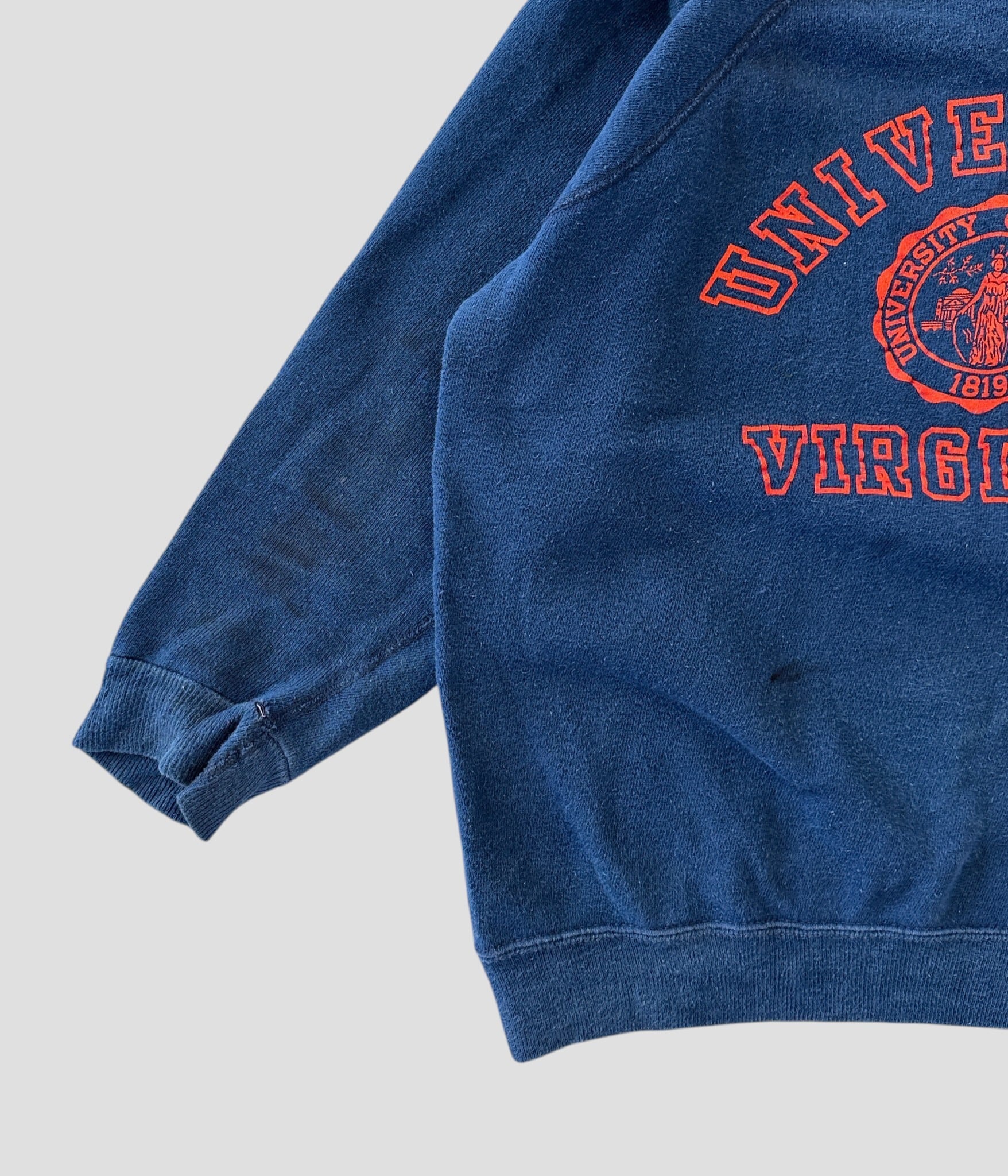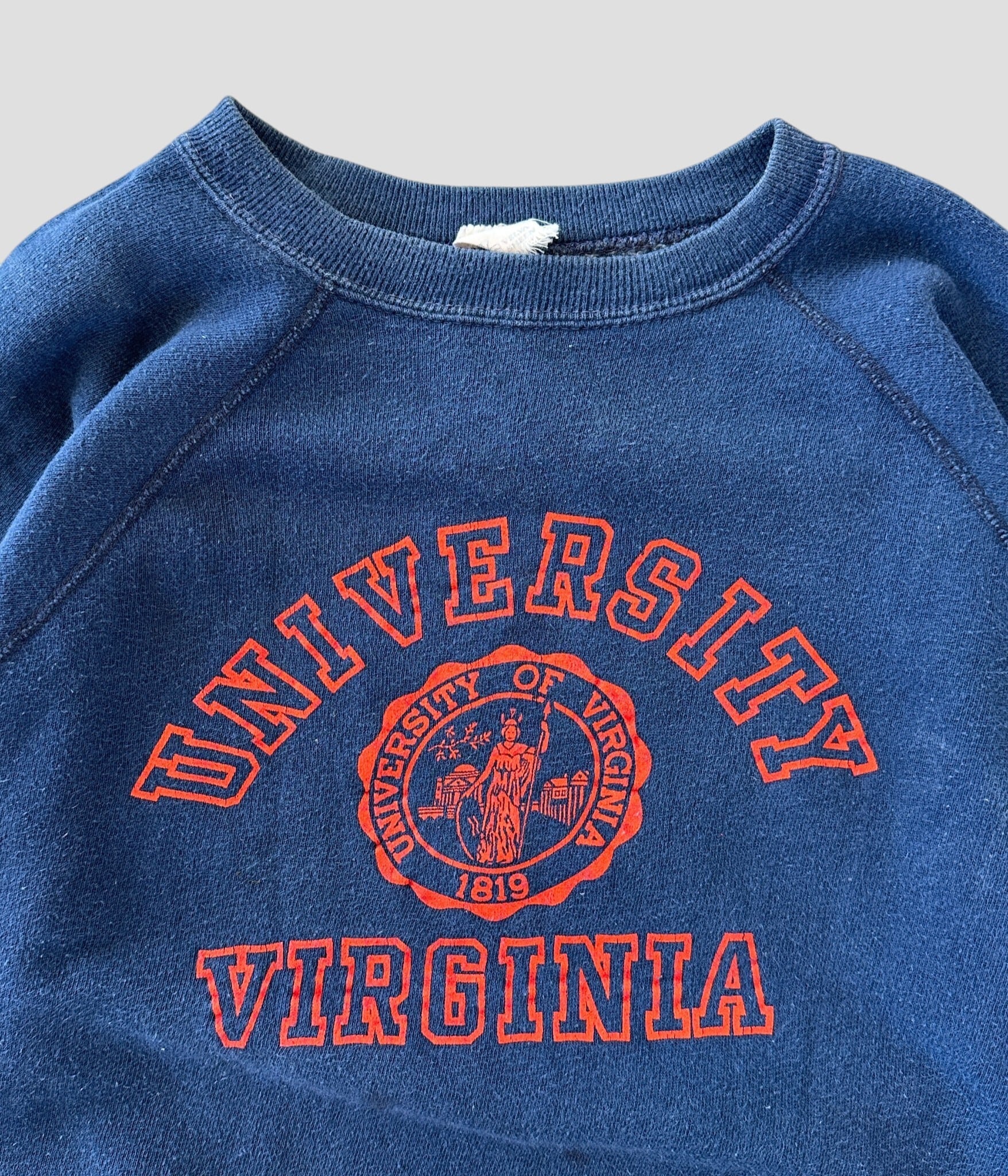 ネイビーボディにオレンジのUNIVERSITY OF VIRGINIAの文字と大学のエンブレムが3段にプリントされた1着。