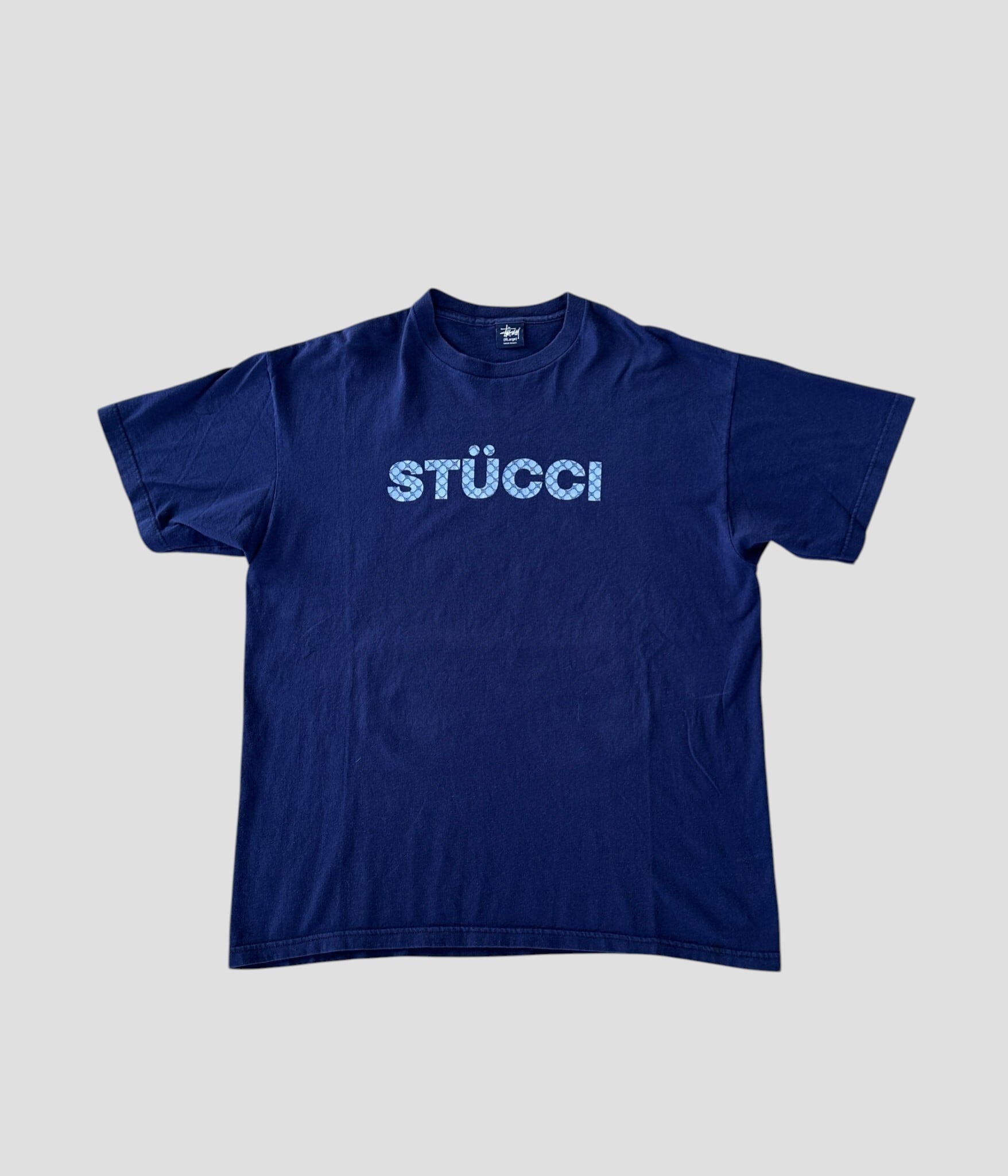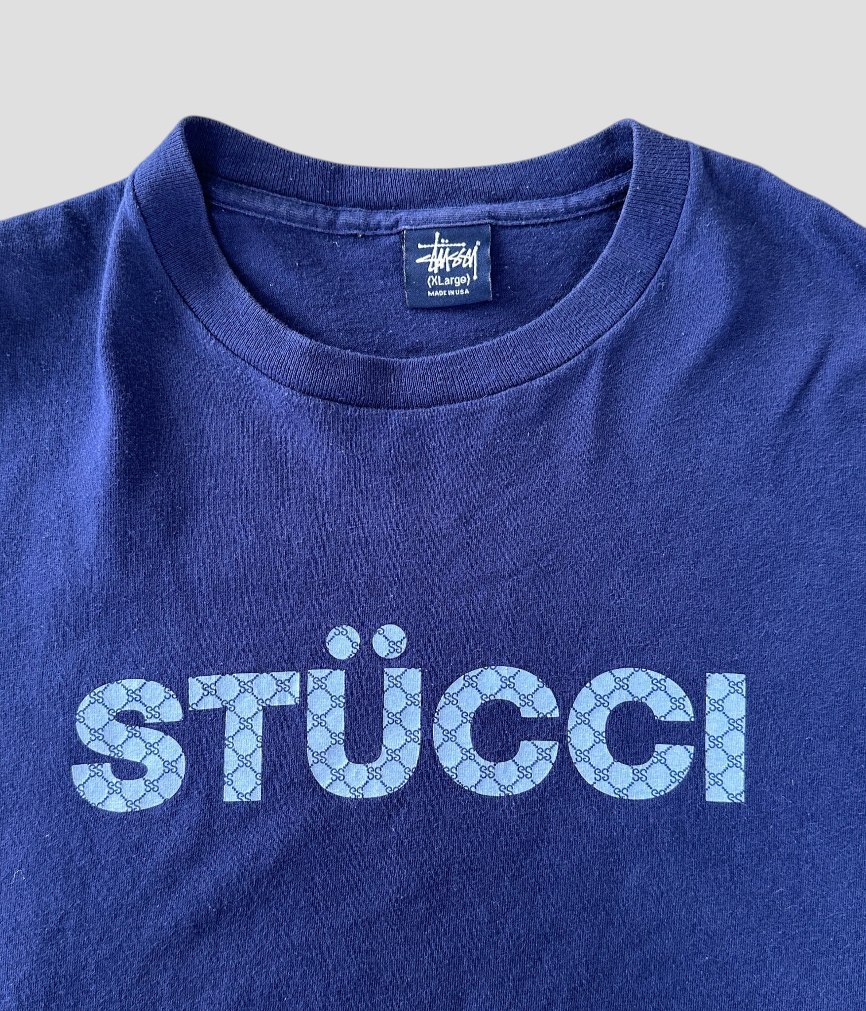 -Stussy- Vintage 90s XL STUCCI Print T-shirt made in USA