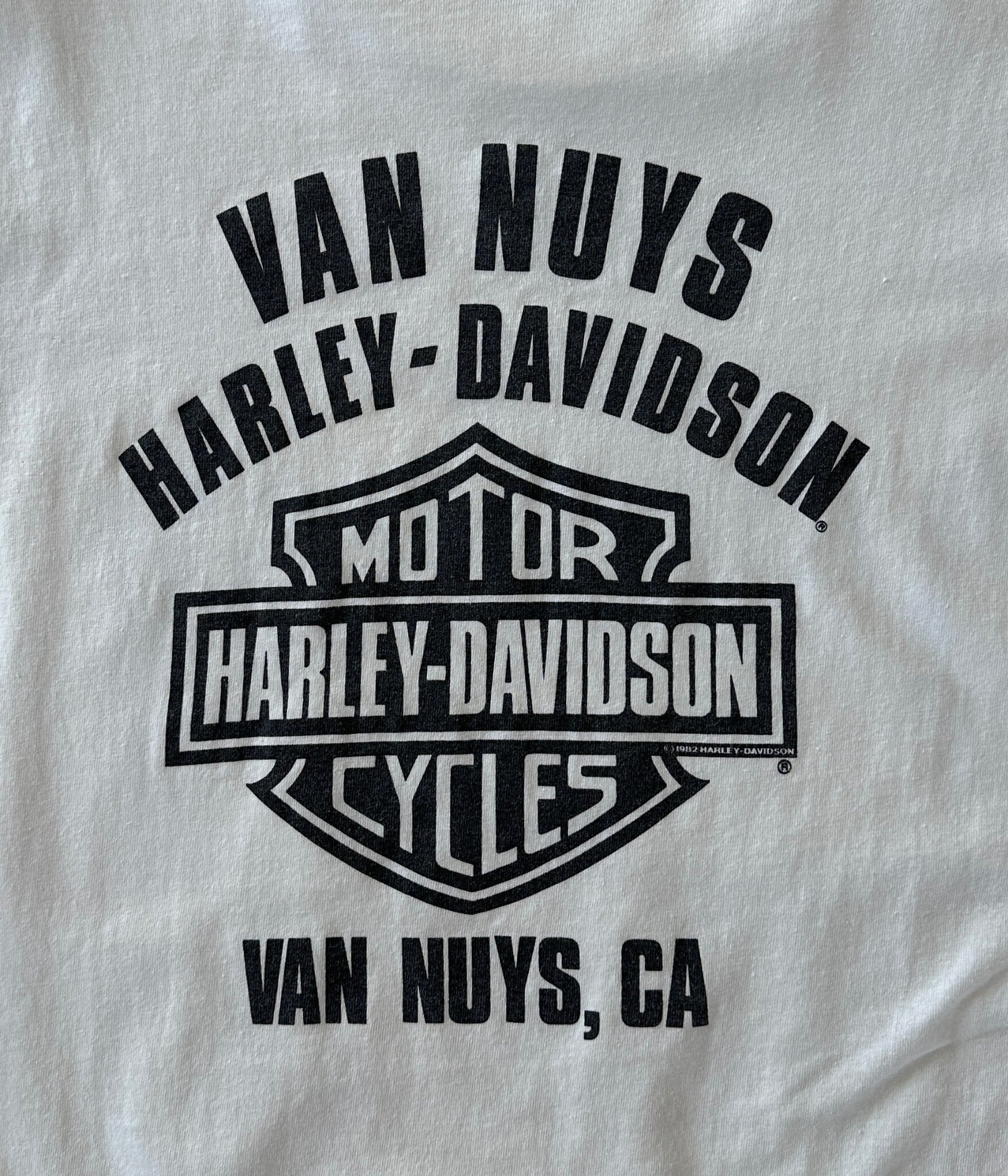 バックにはハーレーの象徴であるバー&シールドロゴと、地名VAN NUYS, CAがバランス良くプリントされた定番かつ王道の1枚。