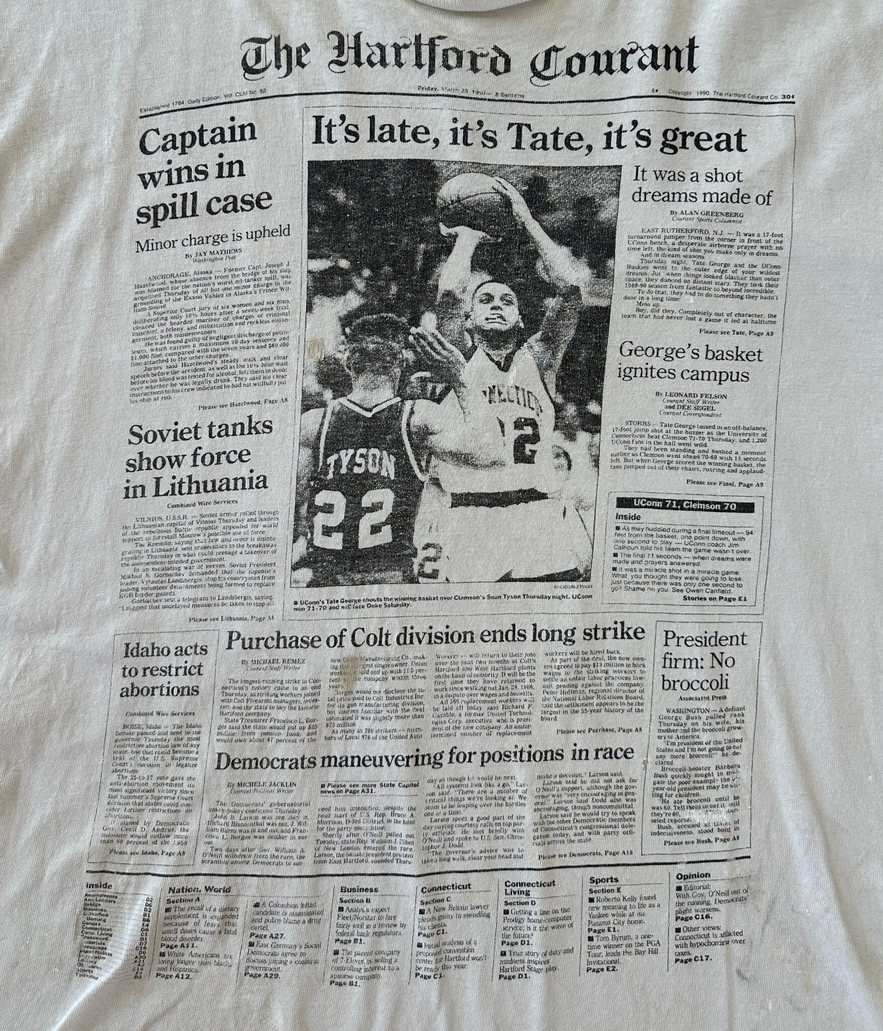 中央のバスケットボールシーンに加え、「Soviet tanks show force in Lithuania」といった当時の緊迫した世界情勢を伝える見出しまで忠実に再現されたアイテム。